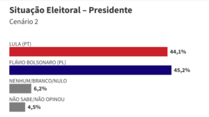 Em um eventual segundo turno da eleição presidencial, o senador Flávio Bolsonaro (PL-RJ) tem 45,2% das intenções de voto contra 44,1% do presidente Luiz Inácio Lula da Silva (PT), segundo levantamento do instituto Paraná Pesquisas divulgado nesta segunda-feira (30). Os números representam empate técnico entre os dois.
